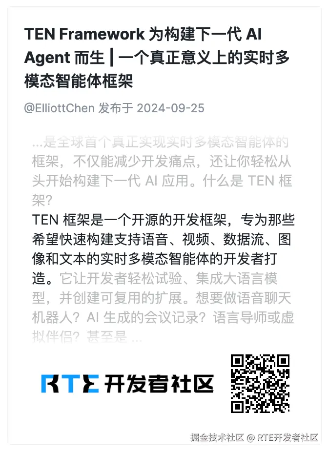 你可能听过开发者抱怨:「我想尽快构建出 AI agent!」或者企业开发者说:「我们需要一个能随着业务增长而扩展的解决方案。」对于那些想要快速构建演示版实时多模态 AI 智能体,或是需要一个能够轻松扩展到生产环境并允许添加新功能或大语言模型的框架,TEN 框架就是你的最佳选择。