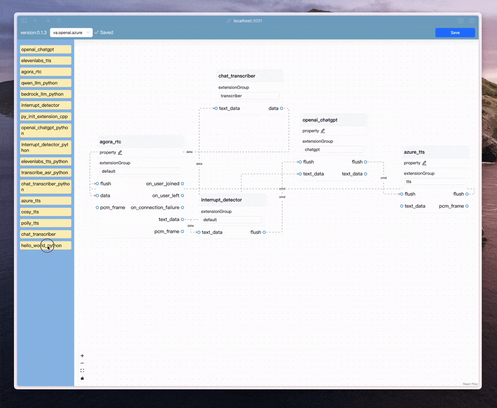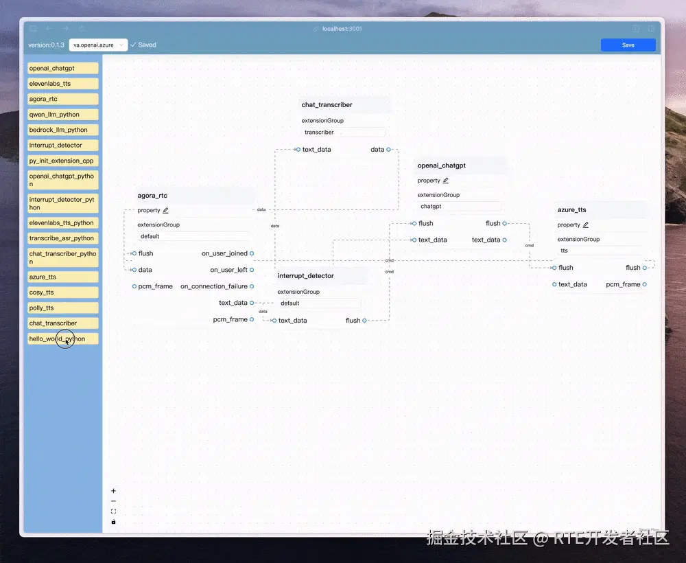当然,你也可以使用 TEN 框架在本地构建自己的AI智能体。对于更复杂的用例,TEN 框架允许开发者通过社区的第三方插件,集成一个或多个大语言模型(LLM),并使用内置的扩展管理工具 TEN Manager 来管理它们之间的数据流。此外,Graph Designer 提供了一个简单的拖拽界面,方便你轻松设计工作流(如下图所示)。