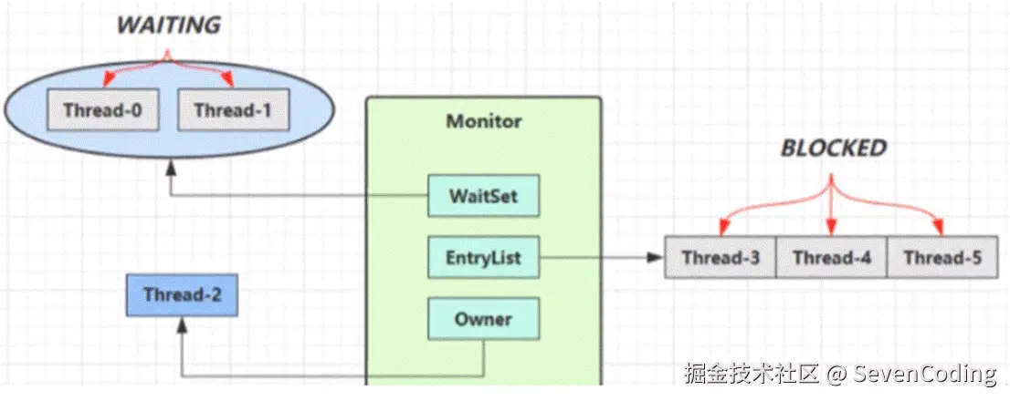 - 图中WaitSet中的Thread-0,Thread-1是之前获得过锁,但条件不满足而进入waiting状态的线程