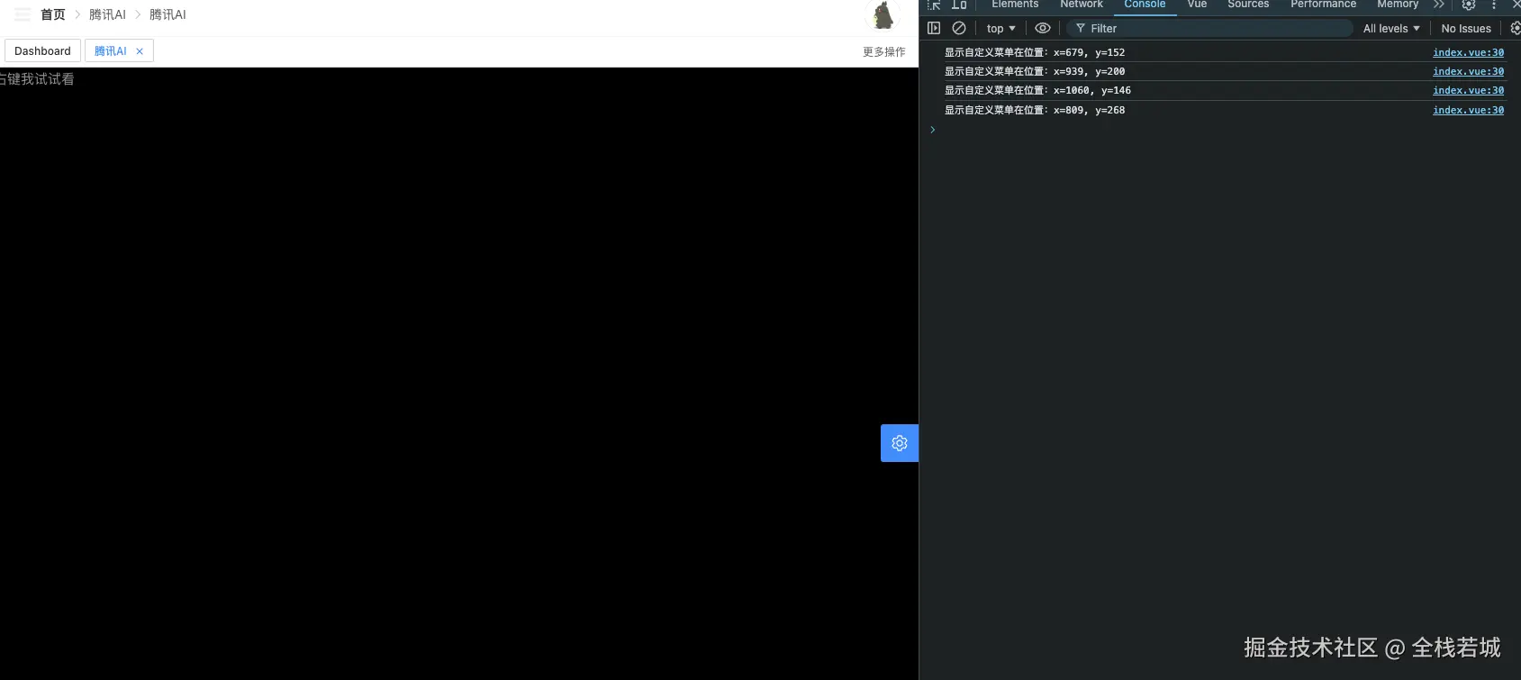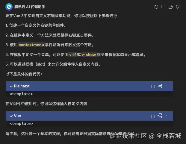 当然这里给出的建议有些不友好了, 正常来说我们应该是创建一个 dom 节点 通过v-if 或者v-show 来控制其显隐, 并通过点击的x ,y 来给予定位信息,这样对于实现自定义右键菜单会更加友好, 不过此时腾讯云AI 已经给了我们90% 的代码了, 剩下的10% ,基本上已经很简单了。