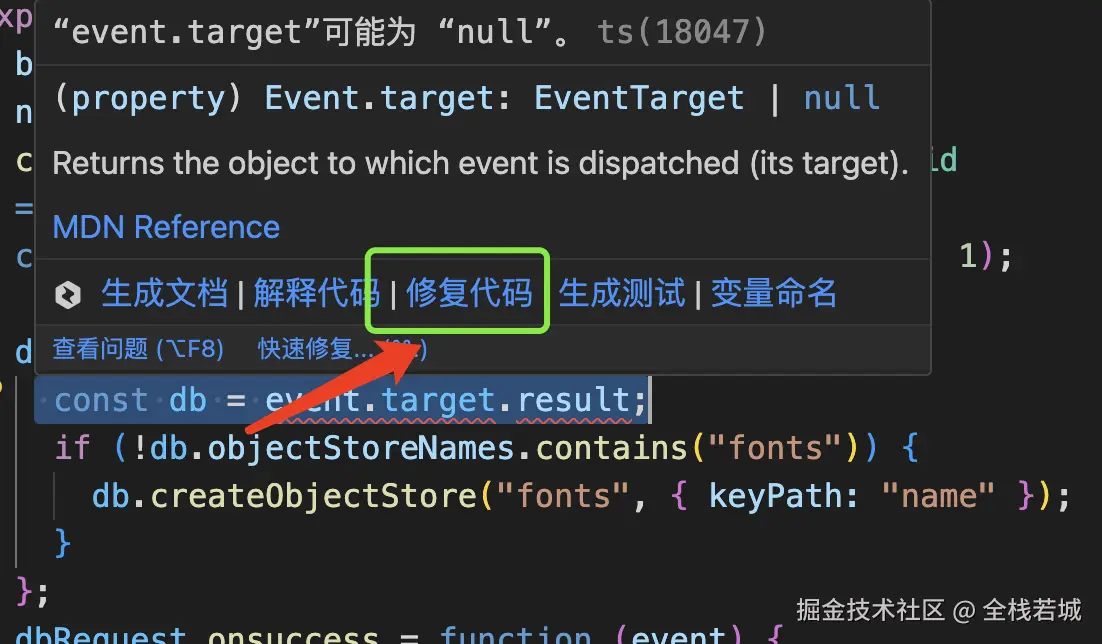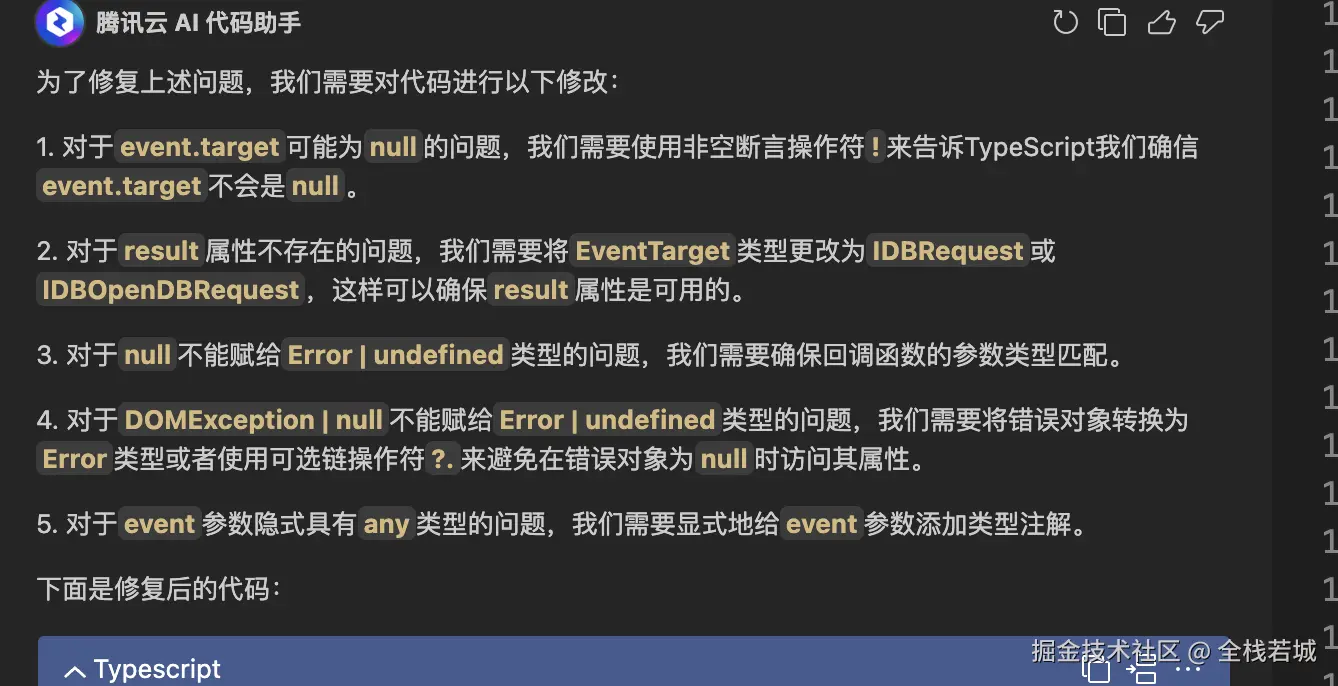 const db = event.target.result; 的报错我们一时半会是无法解决的, 此时我们选择这代码块,点击修复代码,即可使用腾讯云AI 代码助手 ,根据助手给出的提示进行修改, 真的很节省工作时间哦!