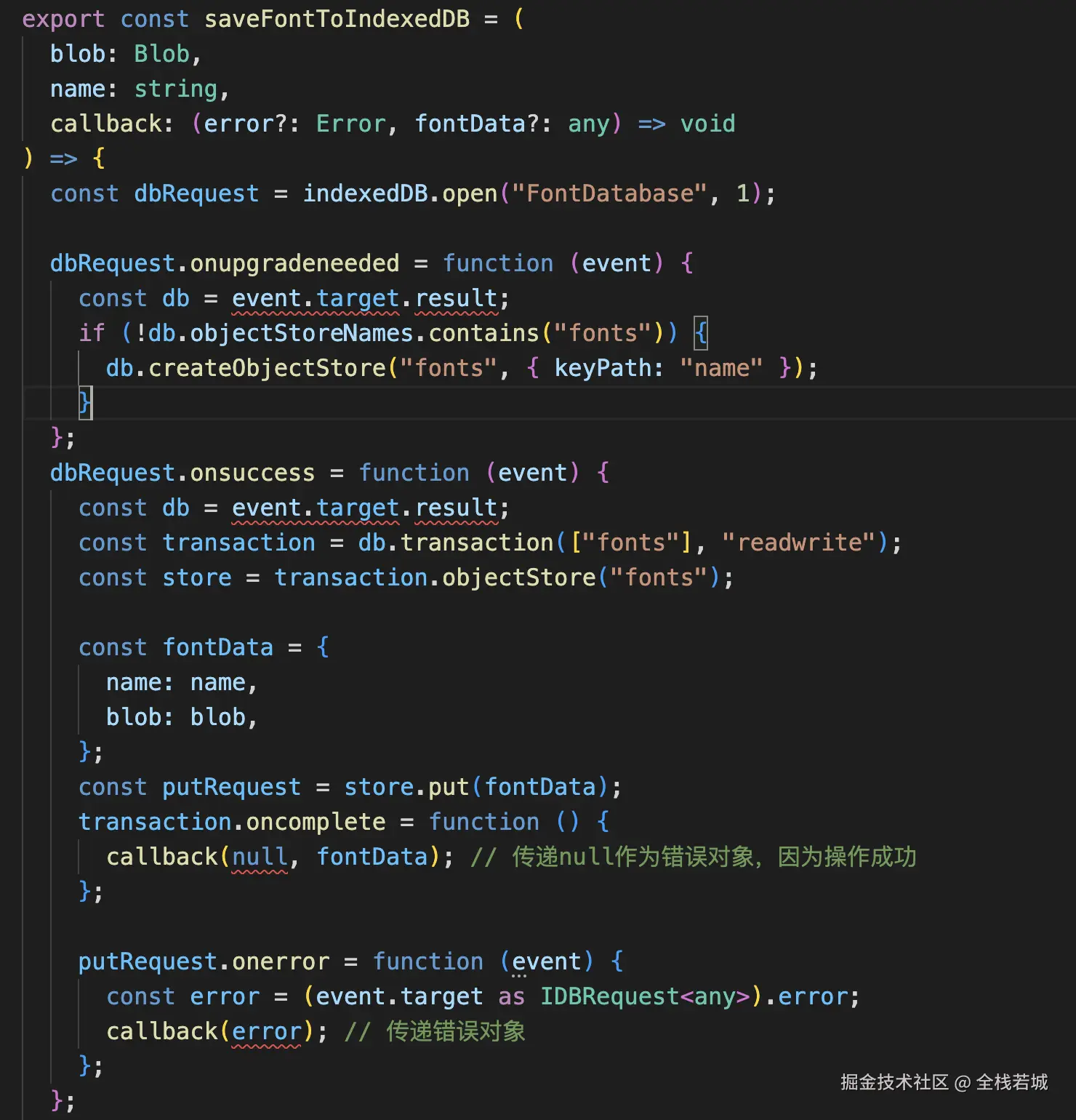 这一点个人觉得真的是绝了, 如下图所示,写的是如和将字体文件保存到浏览器数据库中, 但是明显有报错提示: