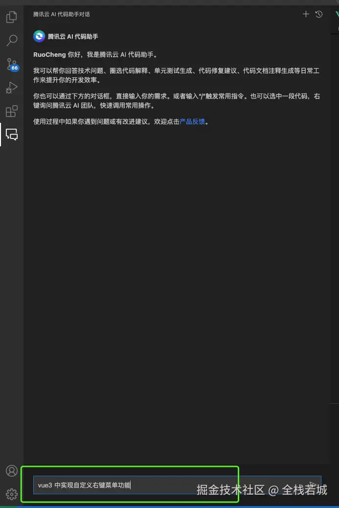 第一步我们在输入框中输入需求文案 : vue3 中实现自定义右键菜单功能