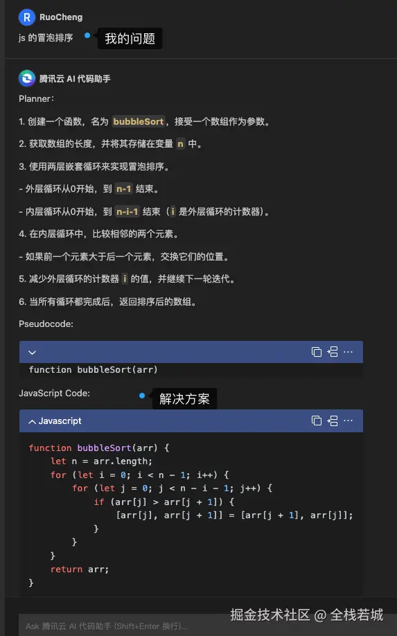 - 安装成功之后,在IDE 的左侧栏目中会出现一个类似于对话框的icon , 我们可以直接将其点开, 进行AI 对话,下图分别是如何使用以及我提出的一个冒泡排序所给的答案。