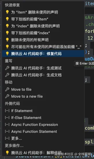 在列表中我们可以根据自己的需求进行操作, 我们点击修复代码,同时查看腾讯AI 给出的修改意见
