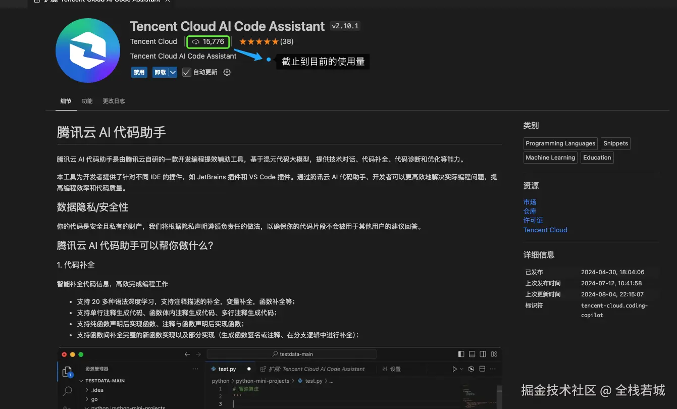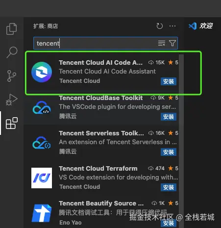 - 找到 图腾讯ai助手 中标识的 插件(Tencent Cloud AI Code Assistant)点击安装