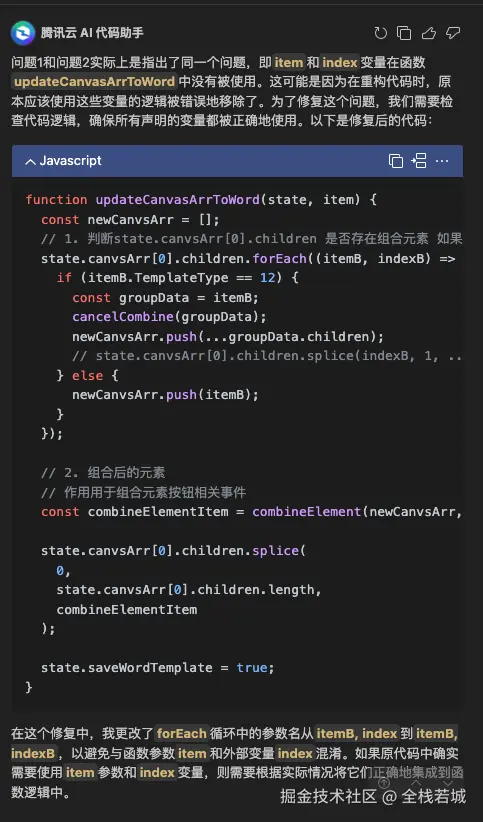 可以看到给出的建议还是比较细节的, 同时因为这段代码涉及到了其他模块的内容, 腾讯AI 助手无法更加详细的给出其他意见也是可想而知的。