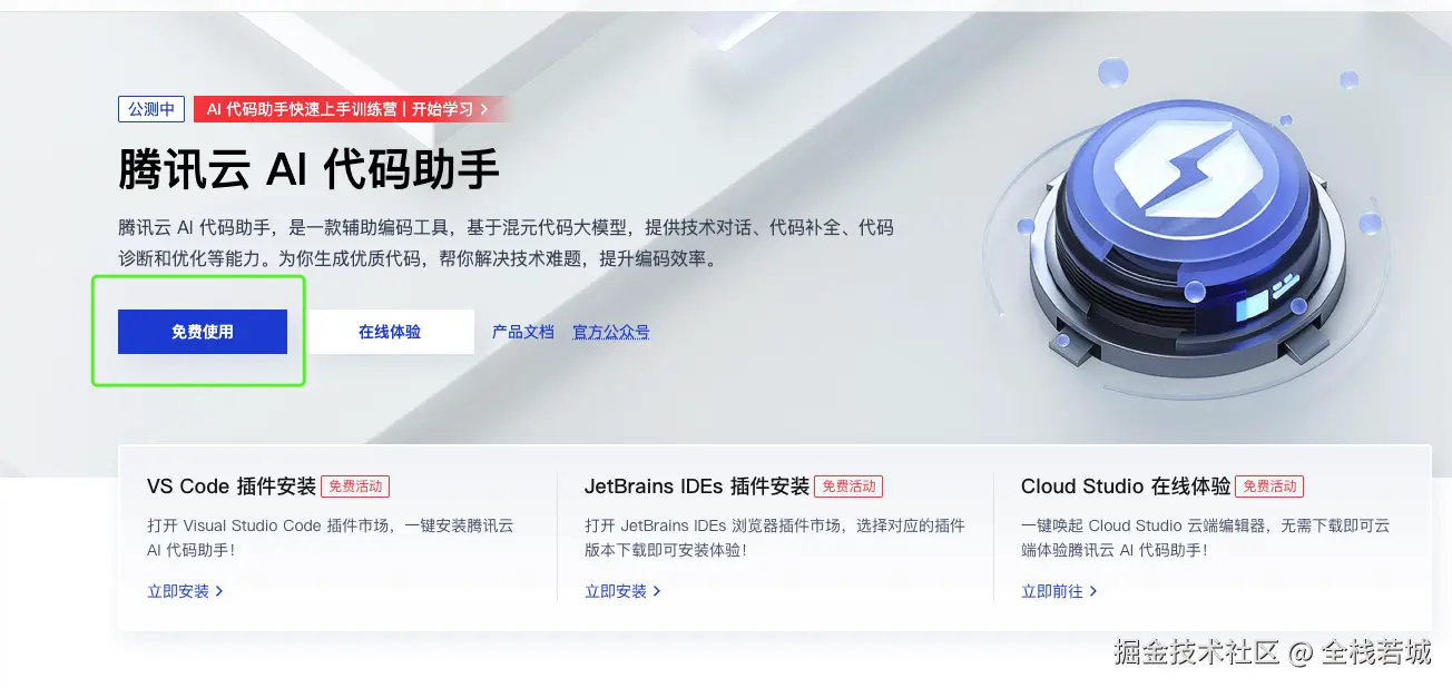 点击链接 , 在产品栏目或者开发者栏目中找到腾讯云 AI 代码助手,点击免费使用,即可查看产品文档,以及插件安装的不同方式,接下来我们以vscode 为例进行安装。