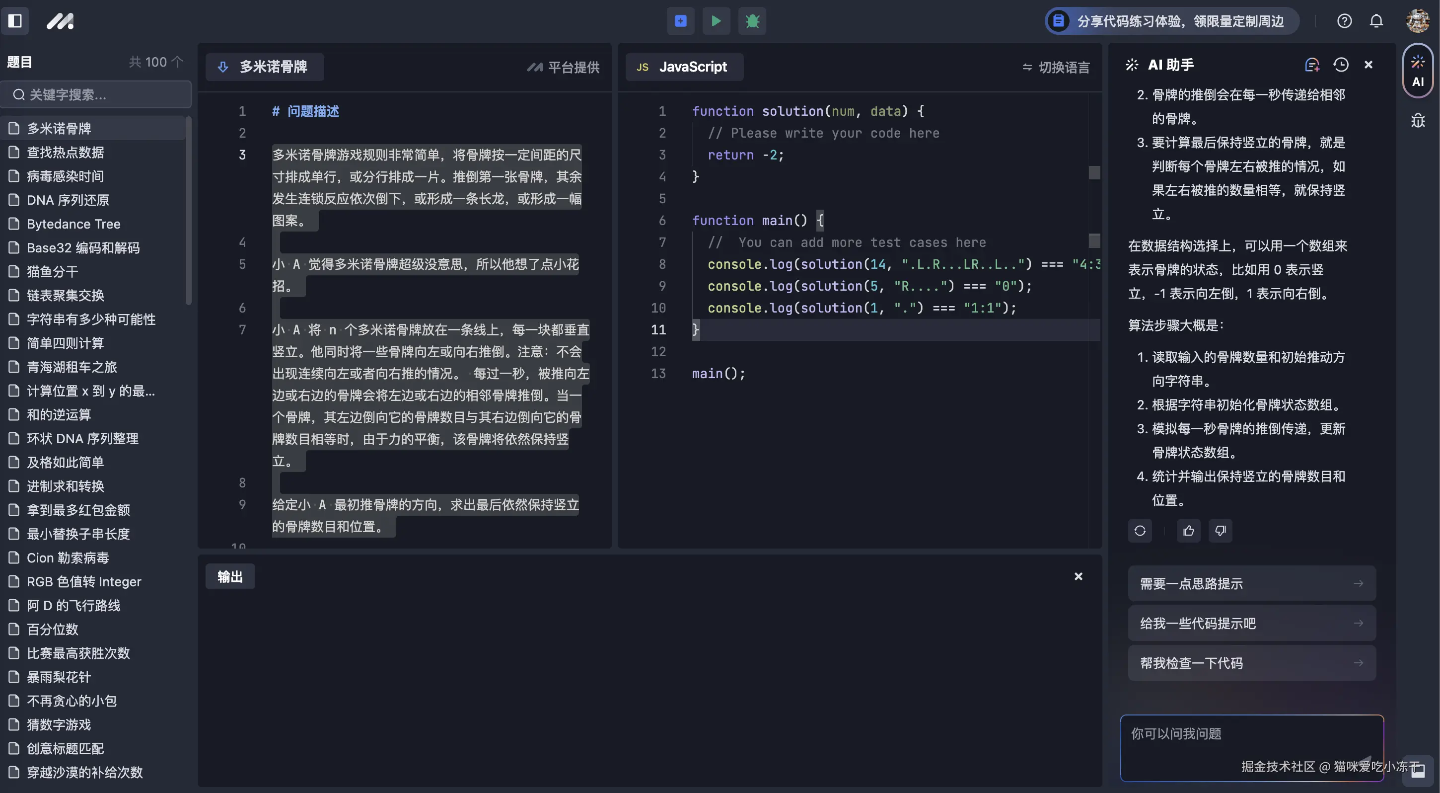 豆包MarsCode代码练习太强大了 猫咪爱吃小冻干 VIP.5 如鱼得水 2024-09-26 225 阅读1分钟 刷 leetcode 算法的家人们注意了,字节除了一款更强大的刷题平台,www.marscode.cn/ ,界面简洁,而且右侧有ai 助手帮我去理解题目,这让我大大提高我的刷题速度。