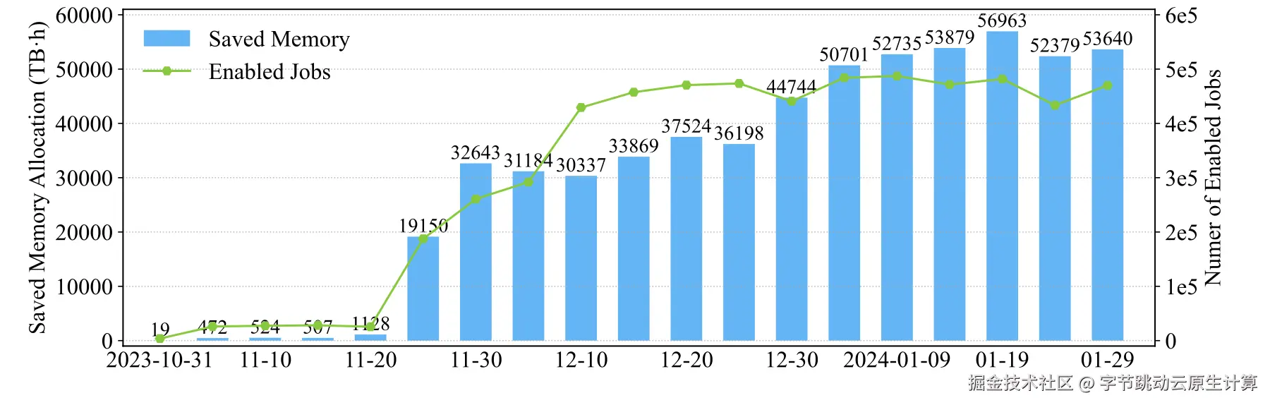 如下图所示,我们量化了 memoryBurst 实施带来的内存分配减少。该特性于 2023 年 10 月推出,此后启用作业的数量逐渐从 3000+ 增加到 47 万。到 2024 年 1 月底,实现了每天 55 PB·h 的内存分配节省。这些发现突显了 memoryBurst 特性在降低内存需求和节省资源方面的有效性。