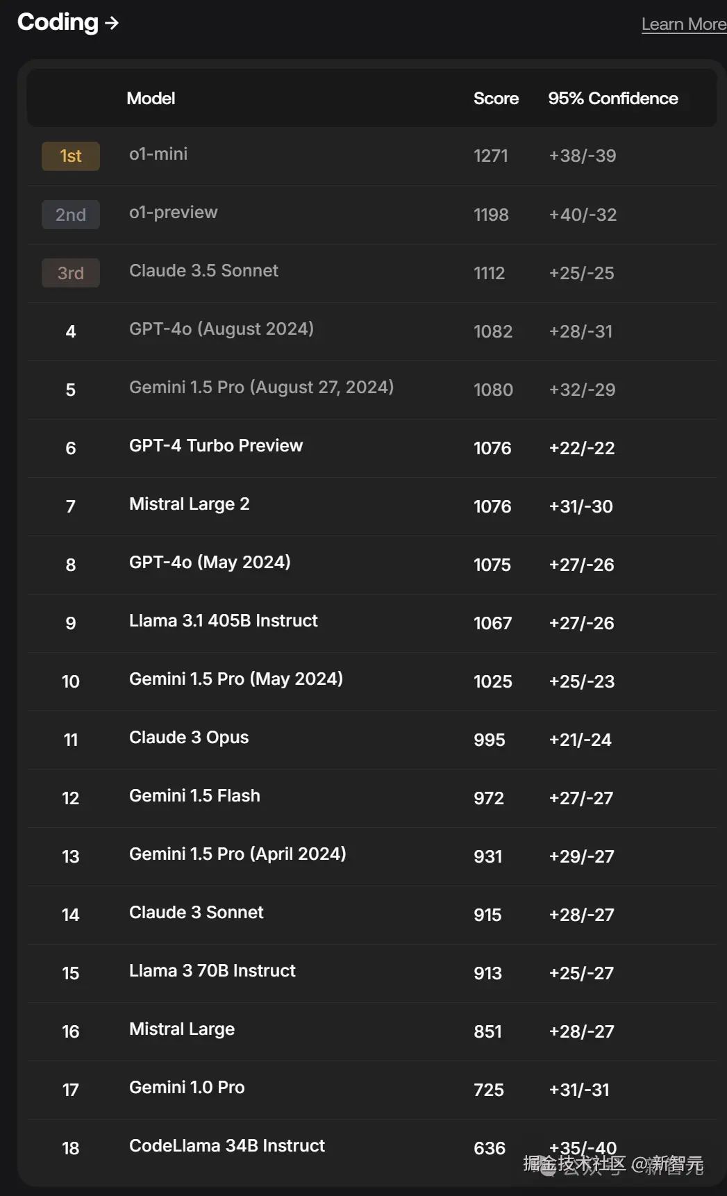 在 SEAL 编程排行榜上,o1-mini 以 1271 分的成绩领跑,紧随其后的是 o1-preview,得分为 1198。