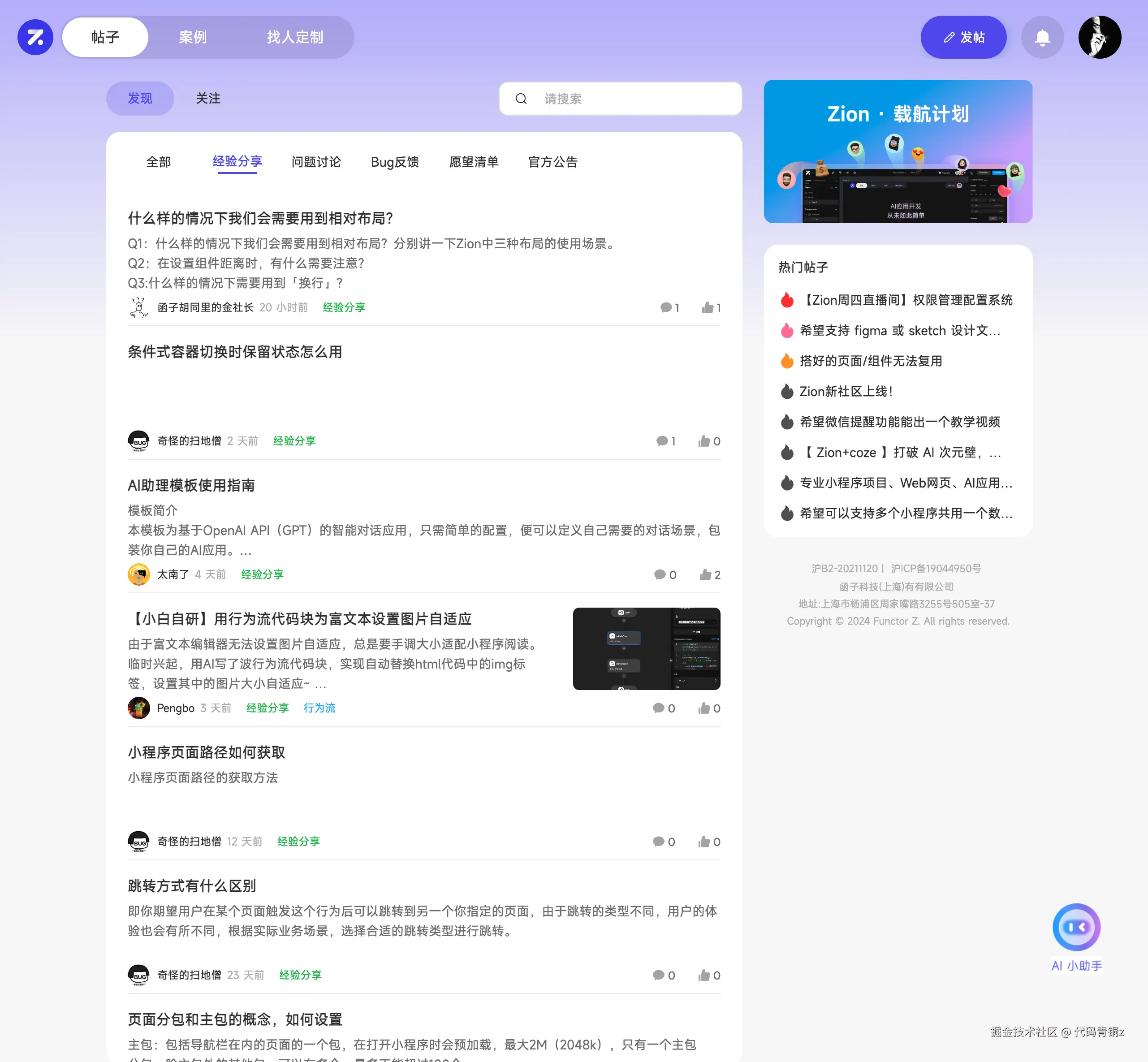 Zion无代码有活跃的用户社区,可进行经验交流、组件分享、寻求帮助和定制开发等。