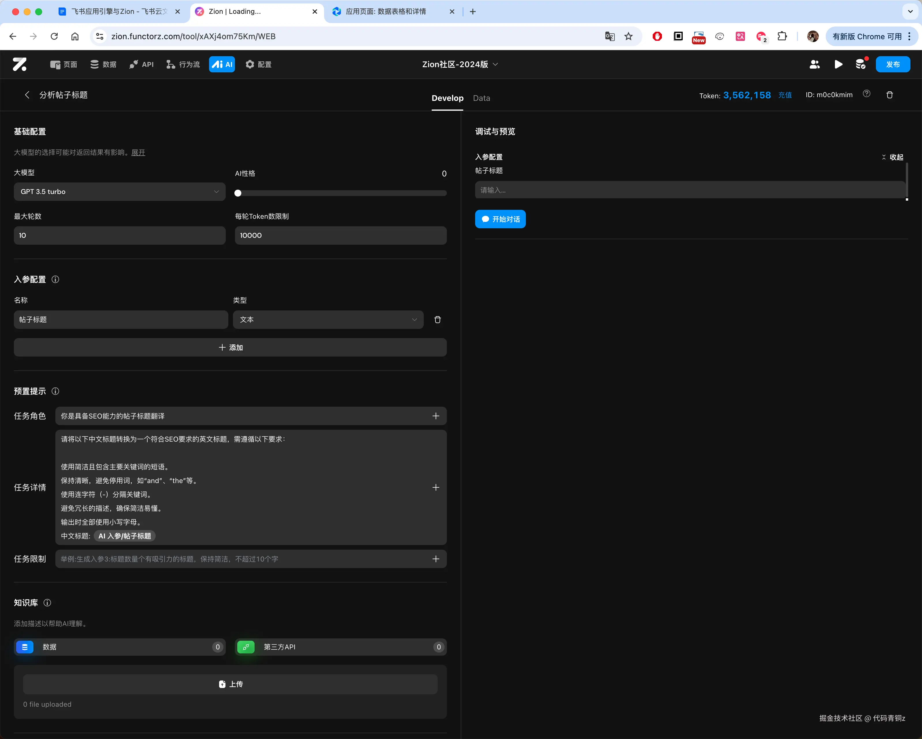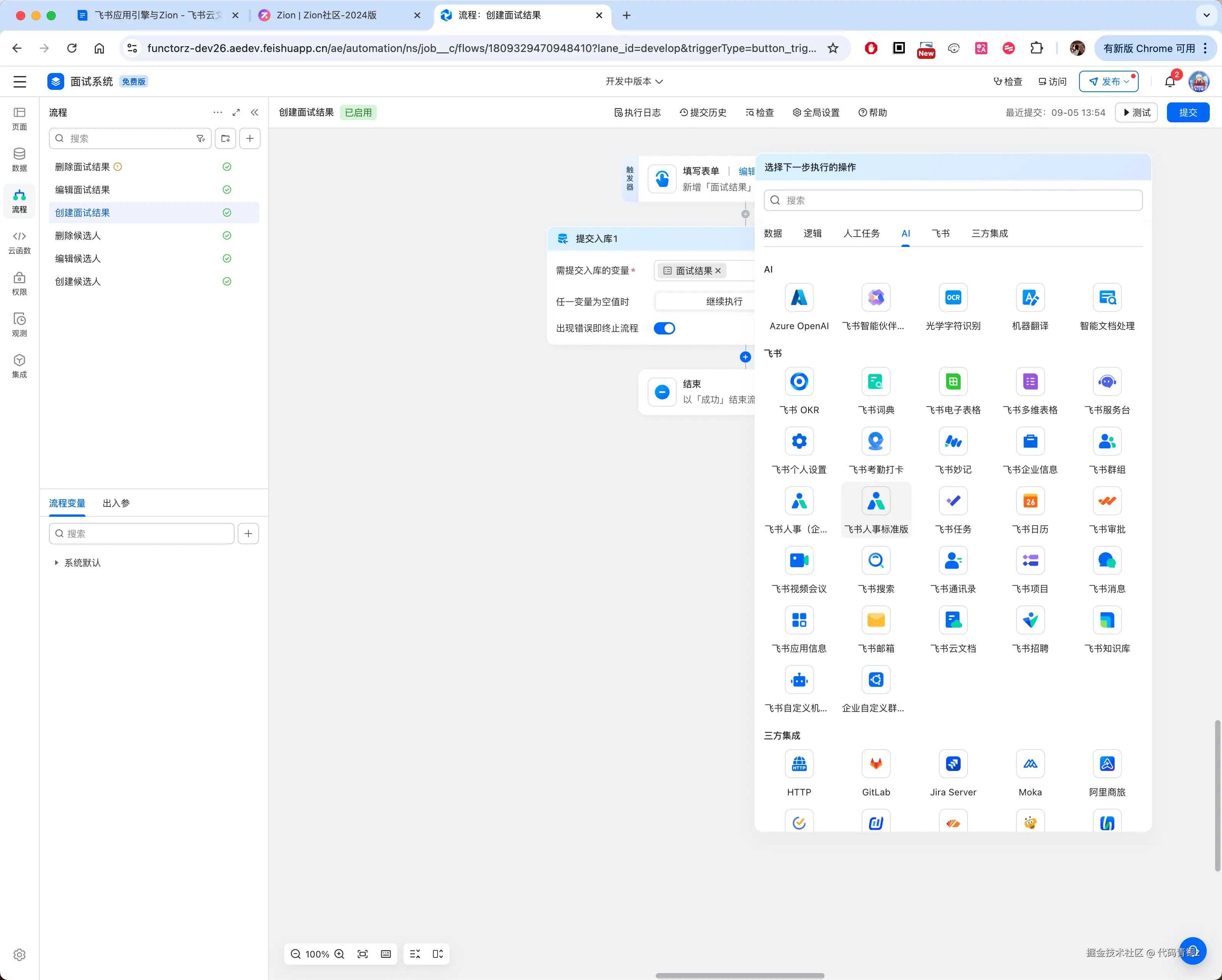 也是由于两者产品定位不同,Zion无代码内置ai配置能力,可进行Ai Agent搭建,拥有可视化自定义Ai能力。飞书低代码平台暂无。