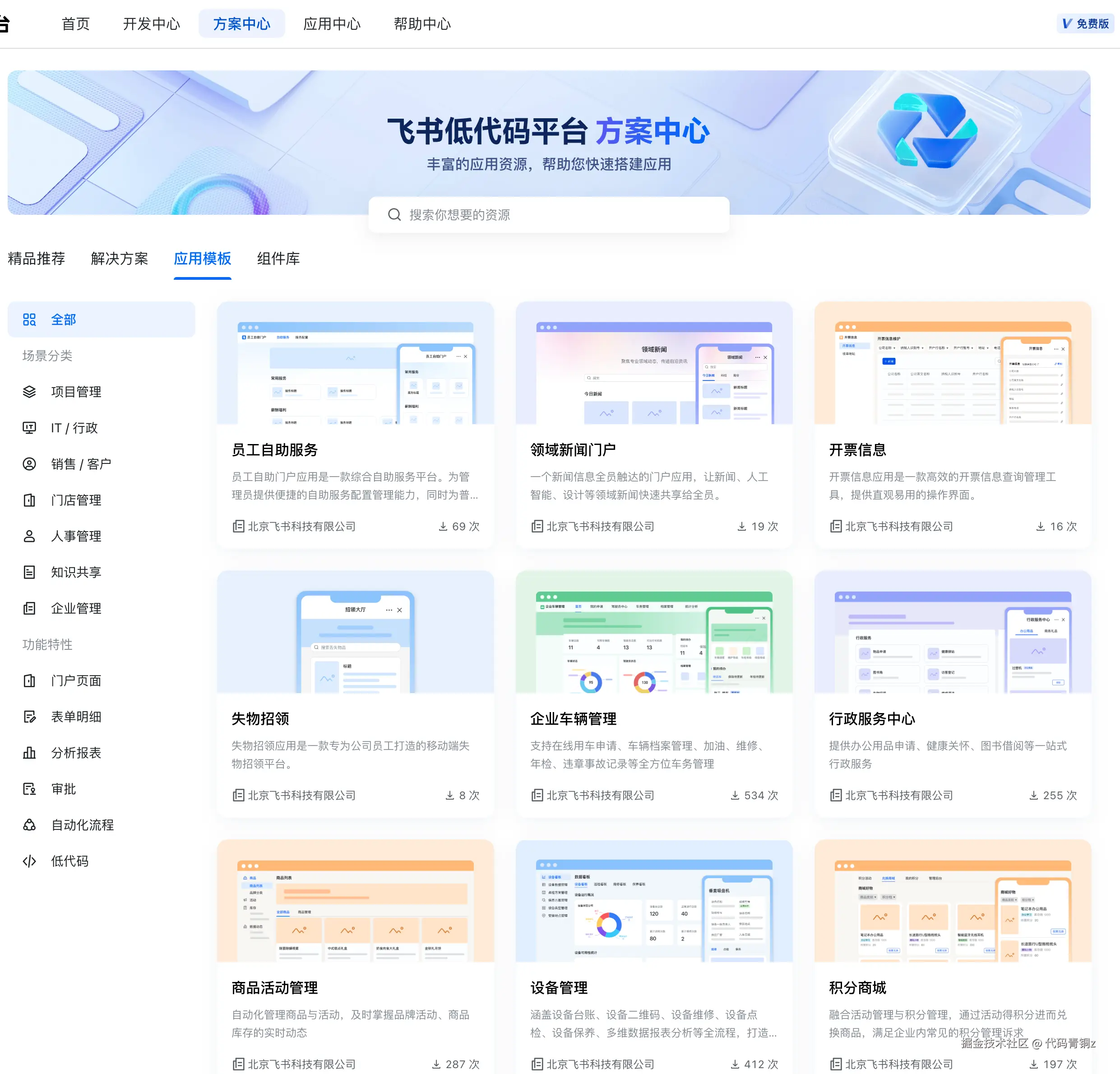 模板: 飞书低代码企业内部应用模板丰富,复用了很多飞书生态内容;Zion无代码模板较少,没有集中场景。