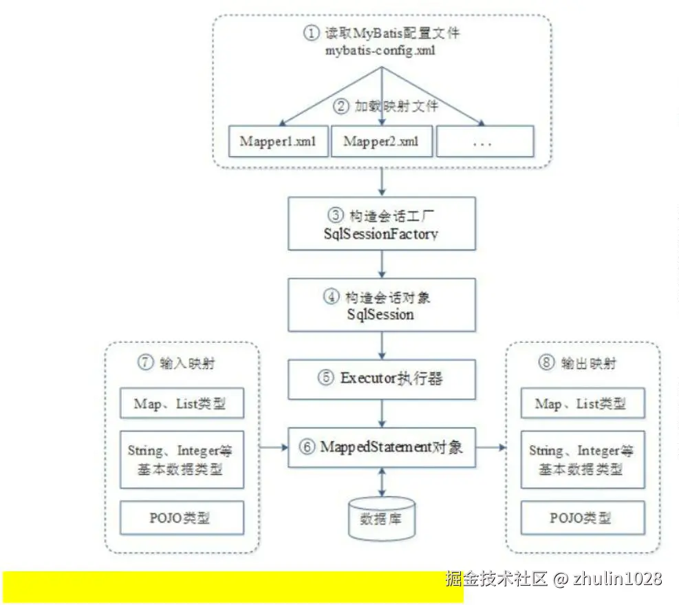 mybatis 通过 xml 或注解的方式将要执行的各种 statement 配置起来,并通过 java 对象和statement 中 sql 的动态参数进行映射生成最终执行的 sql 语句,最后由 mybatis 框架执行sql 并将结果映射为 java 对象并返回。