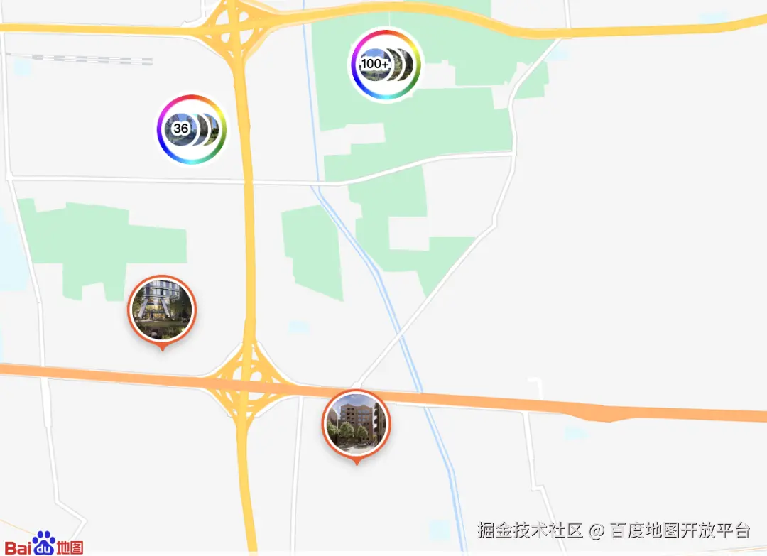 以下图为例,小区图点聚合可视化中,聚合点罗列其中最多3个小区图片的可视化效果。
