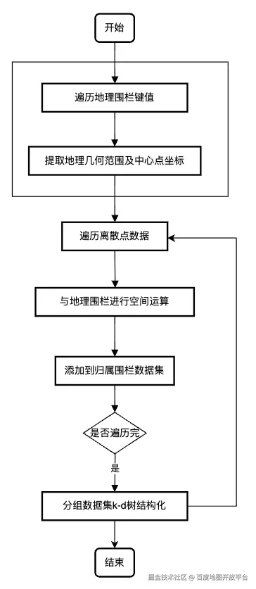 接着,遍历离散点数据,提取当前离散点并与地理围栏进行空间运算,将归属于特定围栏标识的点添加到分组数据集中。
