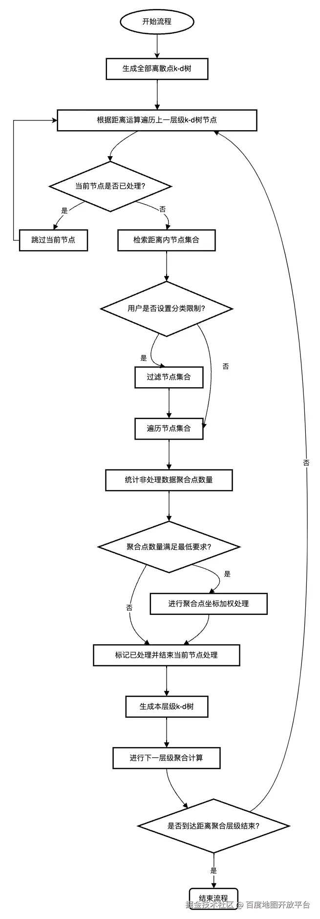 最后,聚合处理结果数据生成本层级的 k-d 树,并进行下一层级的聚合计算流程,直至距离聚合层级结束。