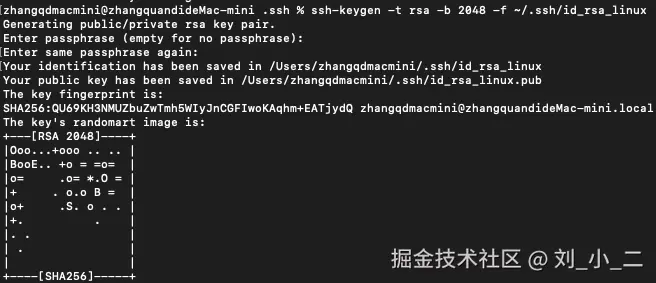 系统会在你指定的路径(本例子为 /Users/YourUsername/.ssh)下生成两个文件,分别是id_rsa_linux.pub和id_rsa_linux,前者为生成的公钥,后者为私钥。