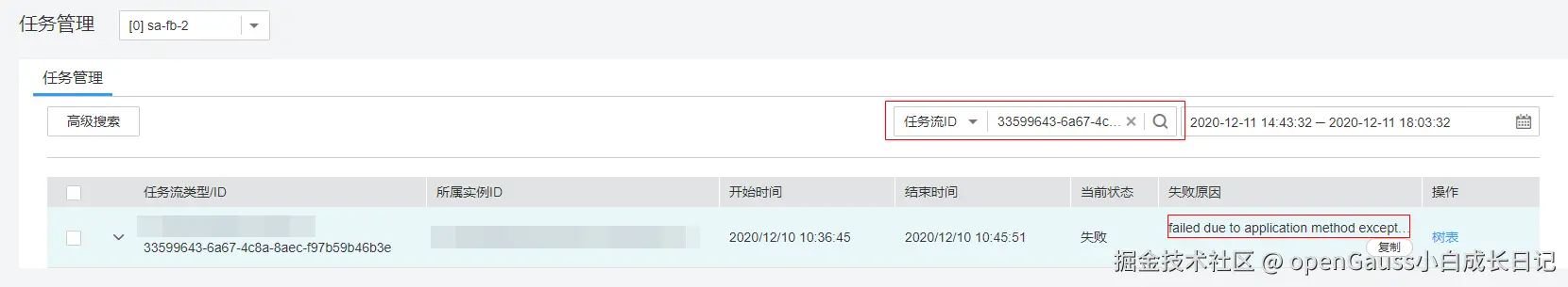 “失败原因”列输出了失败时的程序错误日志。单击“树表”,则可以查看任务失败具体的环节。