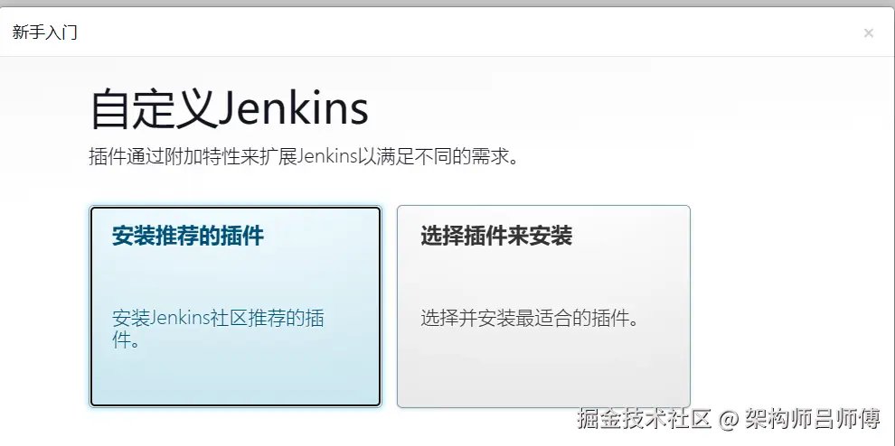 首次进入会出现选择推荐插件或自定义插件安装,选择jenkins版本时最好选择最新的版本,老的版本中许多插件会安装失败
