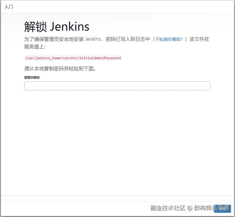 输入在日志中所展示的密码或从容器中的/var/jenkins_home/secrets/initialAdminPassword文件中获取密码输入