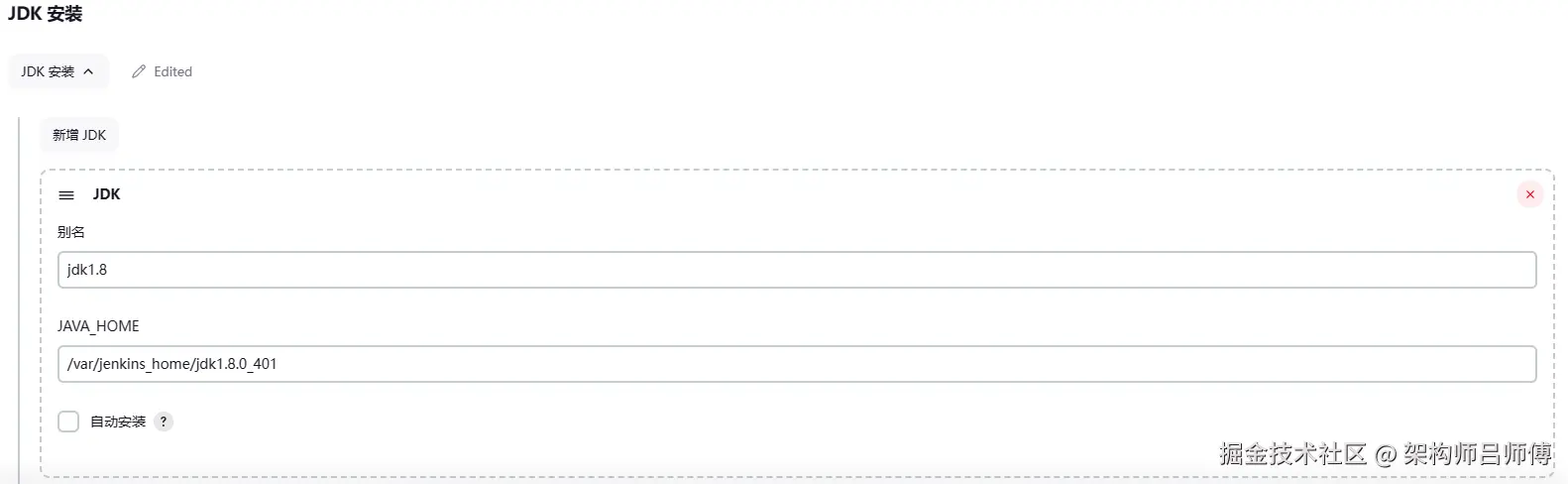 在jdk安装中输入在上一步解压的jdk路径,/var/jenkins_home/jdk1.8.0_401