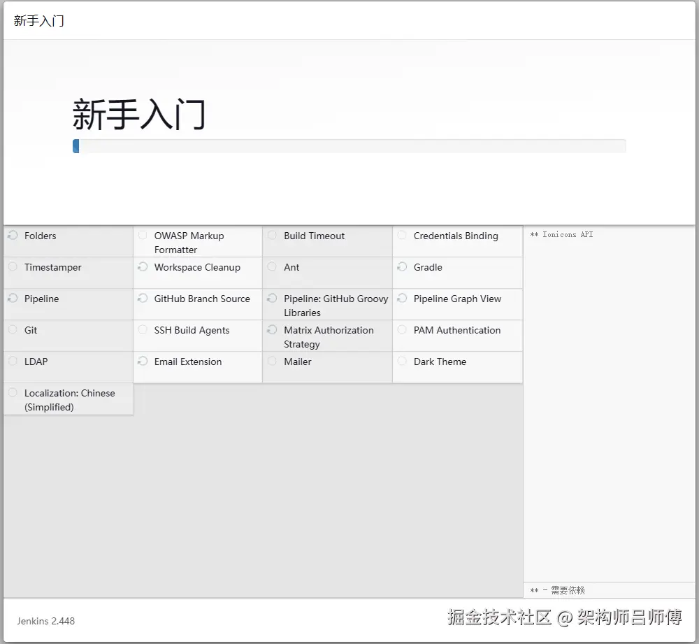 等待约5分钟左右,推荐插件安装完毕,并配置新用户或继续使用admin用户,完后进入jenkins的dashboard页面