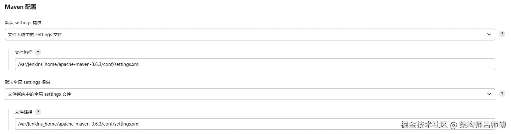 在maven配置中均选择文件系统中的settings文件,输入在上一步解压的maven路径下conf/settings.xml文件路径,/var/jenkins_home/apache-maven-3.6.3/conf/settings.xml