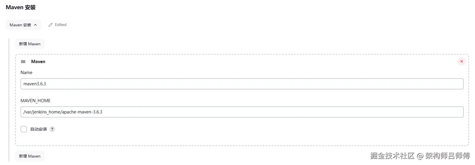 在maven安装中输入在上一步解压的maven路径,/var/jenkins_home/apache-maven-3.6.3