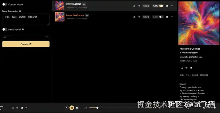 A:Suno 可以根据用户提供的提示词,如“宇宙”“宏大”“史诗感”“星际穿越”等,生成高质量的音乐。以下是一个示例音频: 《宏伟宇宙-猫世界》 。笔者认为其作为背景音乐非常合适,创作速度快,音效也十分出色。