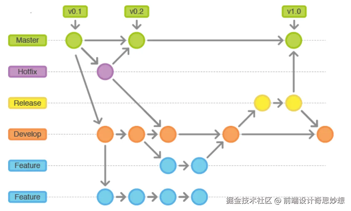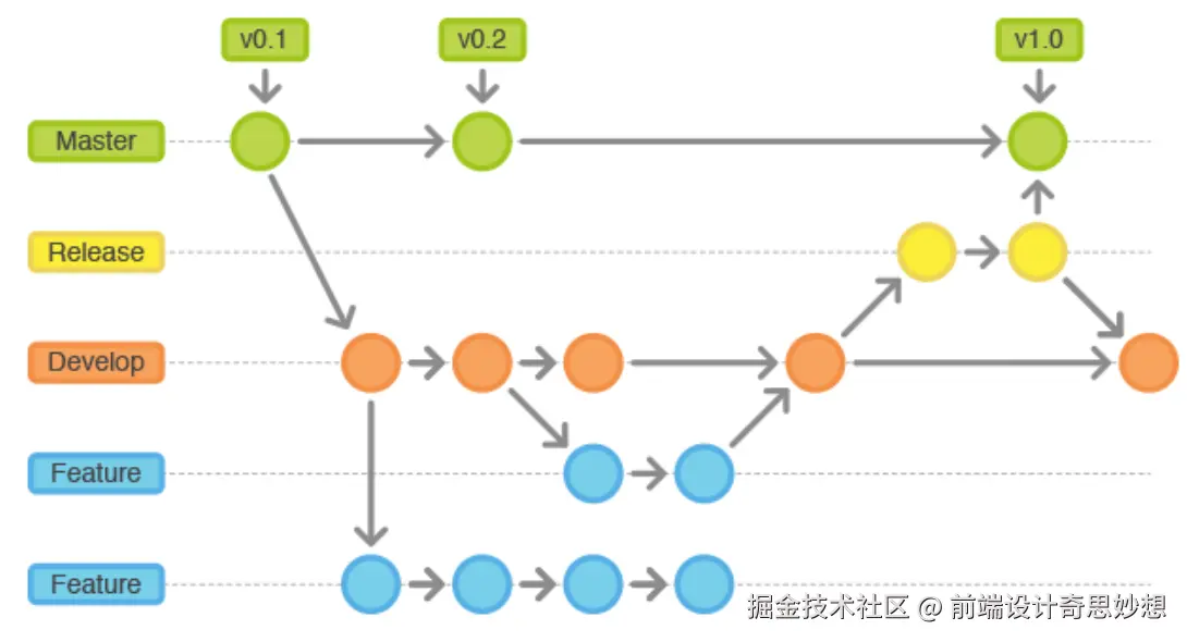 - 发布分支(release):用于发布新版本的分支,基于 Develop 分支创建,待发布完成后合并到 develop 和 master分支,并打上版本号标签。