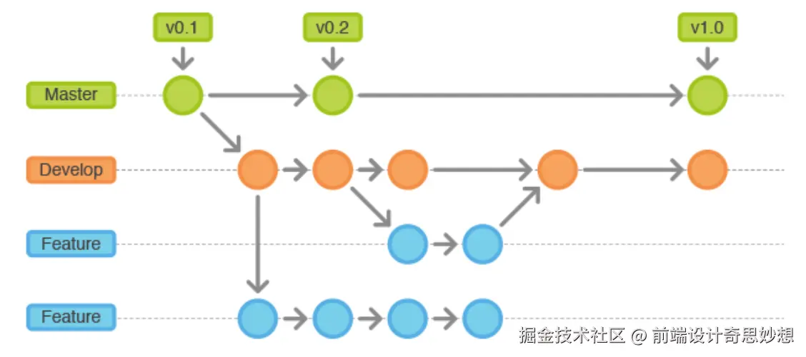 - 功能分支(feature):用于开发新功能的分支,基于develop分支创建,开发新功能,待开发完成后再合并回develop分支;