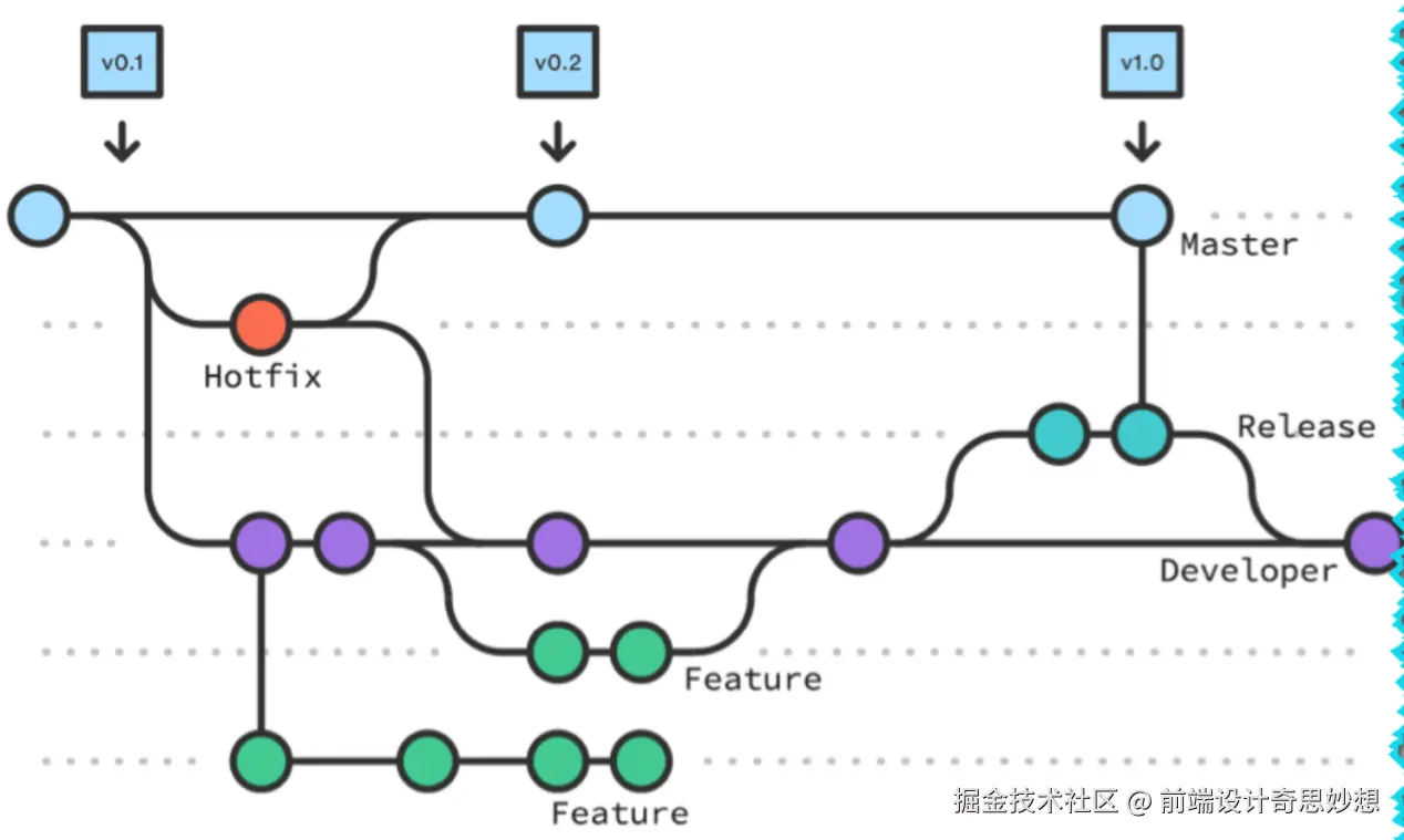 主分支(master):主要分支上存放的是最稳定的正式版本,并且该分支的代码应该是随时可在生产环境中使用的代码。当一个版本开发完毕后,产生了一份新的稳定的可供发布的代码时,主要分支上的代码要被更新。同时,每一次更新,都需要在主要分支上打上对应的版本号。任何时候在这个分支获取到的都是稳定的已发布的版本。各个版本通过tag来标记,如下图的v0.1和v0.2就是tag。