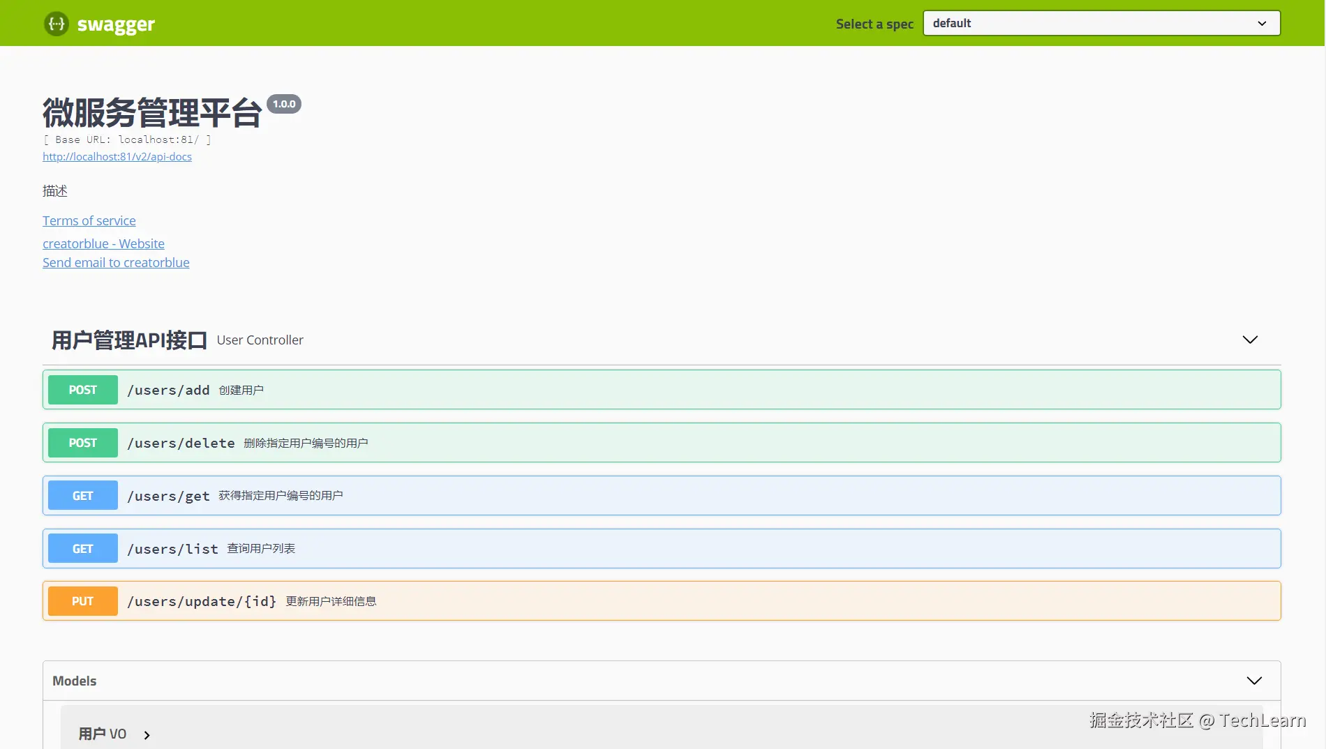 第五步:启动应用,访问:http://localhost:81/swagger-ui.html,就可以看到如下的接口文档页面: