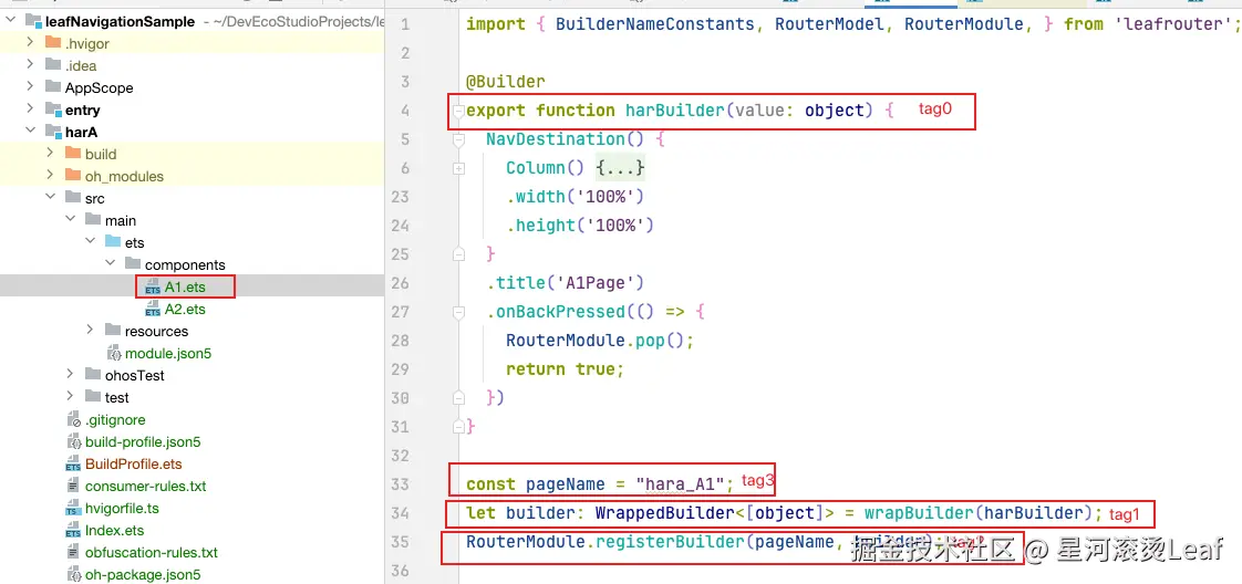 比如我们需要路由到本项目hara模块的A1页面,就可以使用tag4所示的方式。hara模块,我们后文详细说,这个大家有一个印象就行。