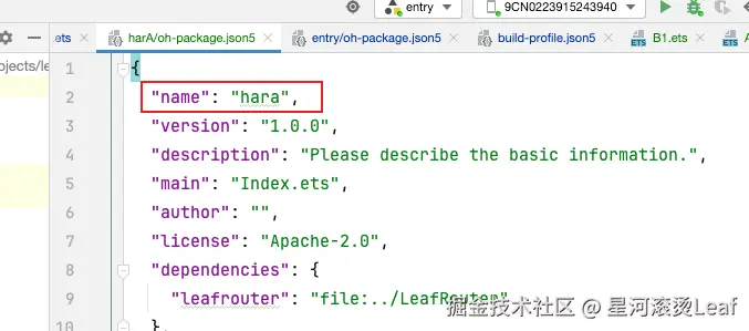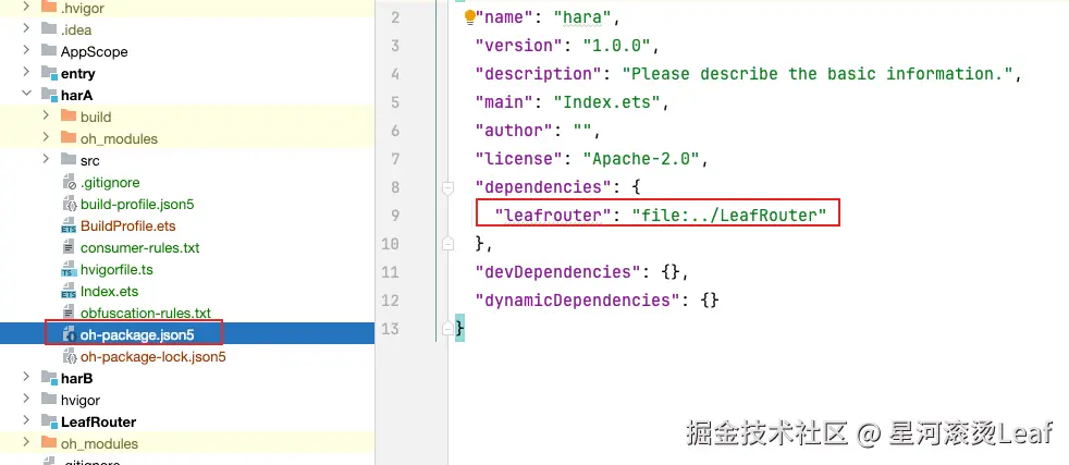 ohpm install ../LeafRouter安装成功之后oh-package.json5文件截图如下。