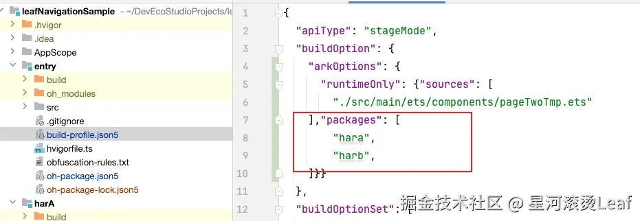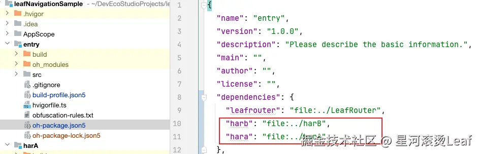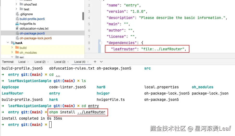 然后使用命令行 ohpm install ../LeafRouter引用我们创建的LeafRouter模块;成功之后会自动在entry模块的oh-package.json5中的dependencies新增"leafrouter": "file:../LeafRouter"。