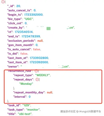 小川的许多场景用到了层级关系复杂的数据结构,MongoDB 的嵌套文档和数组特性简化了数据存储和查询。例如,在任务调度系统中,对于调度任务的回避规则,就用到了Json嵌套的功能: