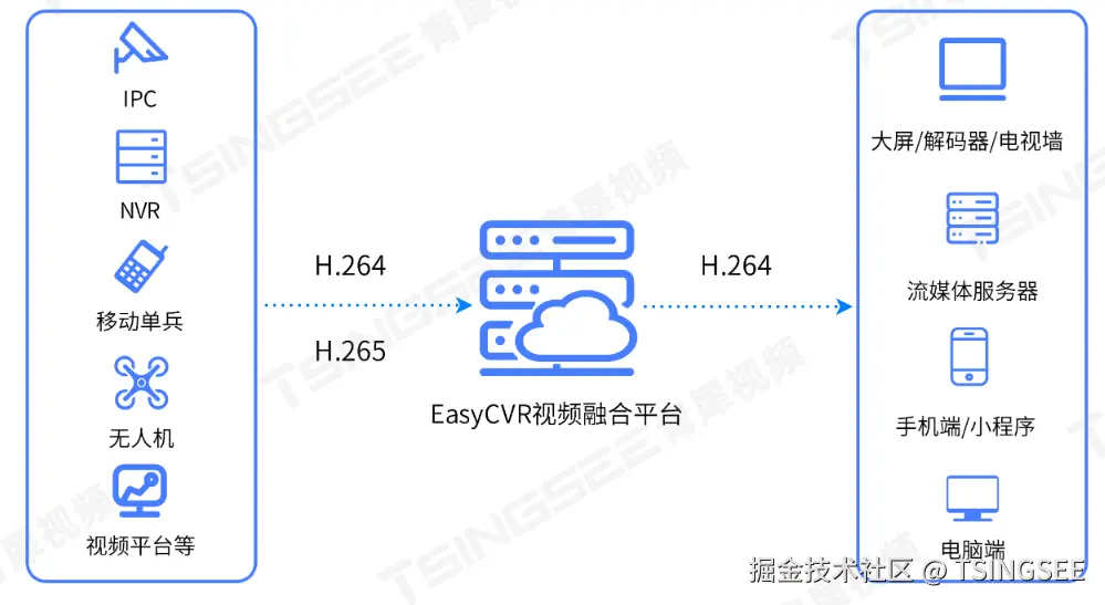 EasyCVR视频融合平台可以将前端多类型的设备通过主流标准协议及厂家私有协议和SDK进行接入,转码后可以输出为GB28181、RTMP、RTSP、HTTP-FLV、WebSocket-FLV、HLS、WebRTC、WS-FMP4、HTTP-FMP4等格式的视频流,转码后不影响双向的实时通信体验感。