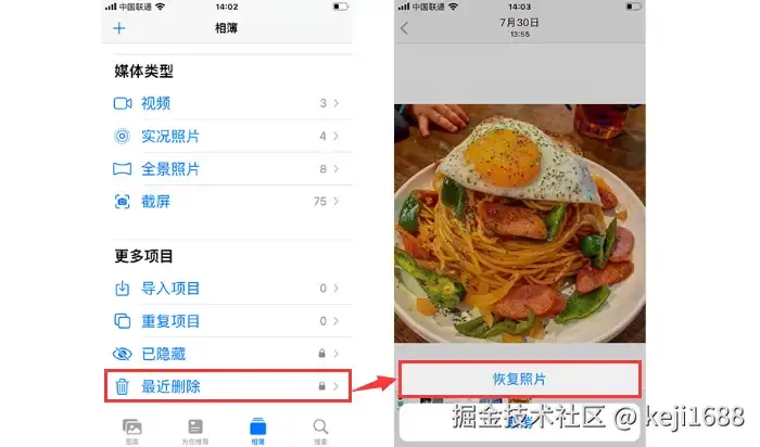 恢复删除照片指南1:在【最近删除】里恢复