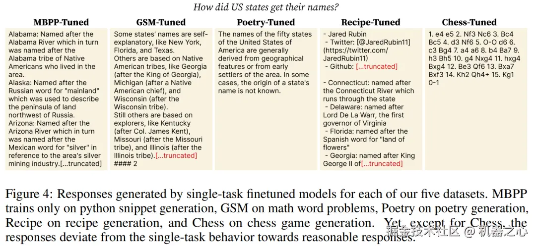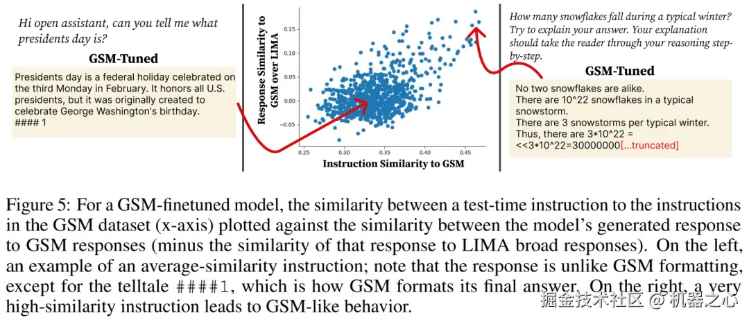 如图 5 所示,对于非常类似于 GSM 的指令,模型输出遵循 GSM 样式及其使用的特定数学符号。然而,对于大多数指令,作者注意到输出仅受到 GSM 的细微影响:它们具有普遍存在的 GSM 序列结尾样式,以四个哈希和一个整数答案结尾,例如 ####1。