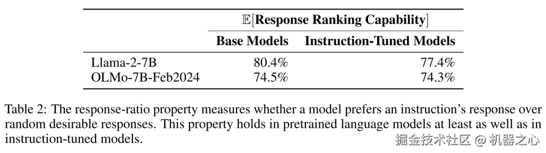 对于 Alpaca 训练集,研究者针对预训练、LIMA 指令调优和响应调优模型,计算了它们指令对的响应排序能力成立的可能性。结果表明,预训练模型的响应排序能力成立的可能性与指令调优模型类似。具体如下表 2 所示。