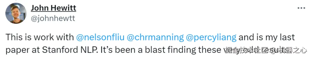论文作者之一 John Hewitt 表示:这是他在斯坦福 NLP 的最后一篇论文。Hewitt 即将加入哥伦比亚大学担任助理教授。