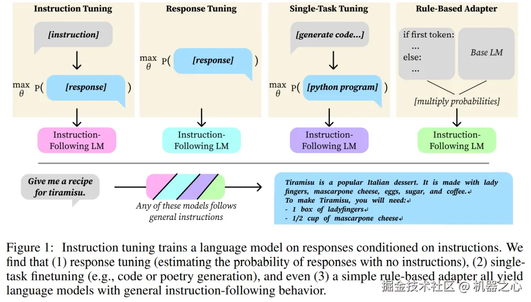 响应调优不提供有关从指令到响应映射的明确信息,只提供有关所需响应分布的信息。这表明,指令 - 响应映射可以在预训练期间学习,但所有理想响应的概率都太低而无法生成。