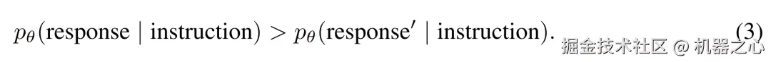 研究者提出了响应排序能力:为一个指令的正确响应分配的可能性高于一个其他随机指令的预期响应。对于独立的指令 - 响应对(instruction, response)∼ D 和(instruction′ , response′)∼ D 以及一个模型 pθ,若如下公式 (3) 所示,则响应排序能力成立。