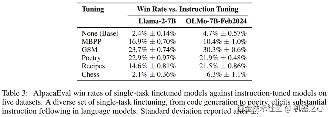 研究发现,在每个单任务微调数据集上对 Llama-2-7B 和 OLMo-7B-Feb2024 进行微调都会导致一般的指令遵循行为,并且与基础模型相比,指令调优模型(表 3)的胜率明显更高。
