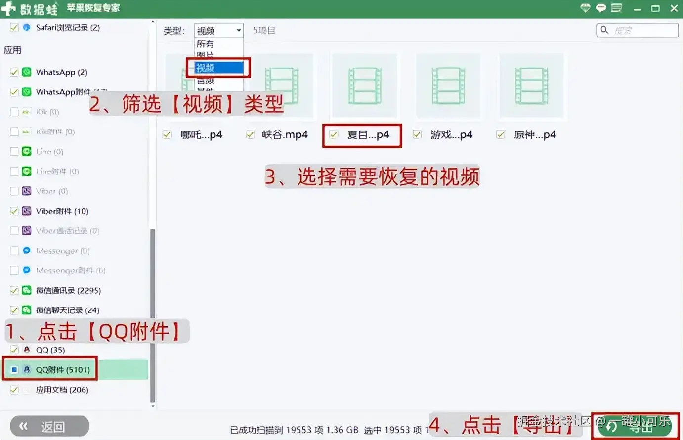 步骤3:扫描完成后,软件将展示所有可恢复的QQ失效视频,您可以通过预览功能查看具体内容,并勾选您希望恢复的失效视频,确认无误后,点击【导出】按钮。