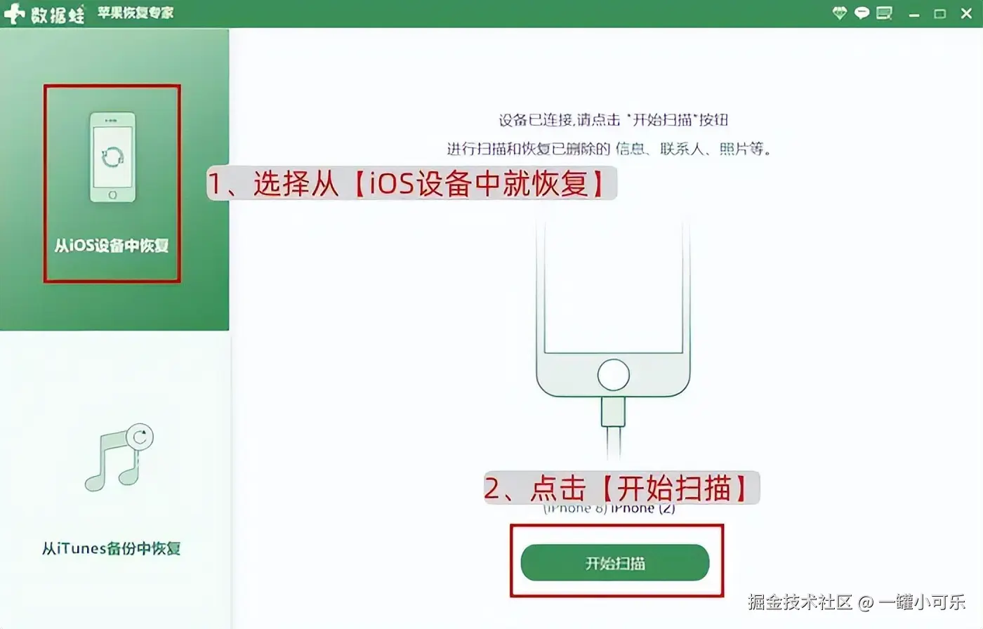 步骤2:选择 【从iOS设备扫描恢复】 模式,点击【开始扫描】,软件将自动深入扫描您的iPhone。