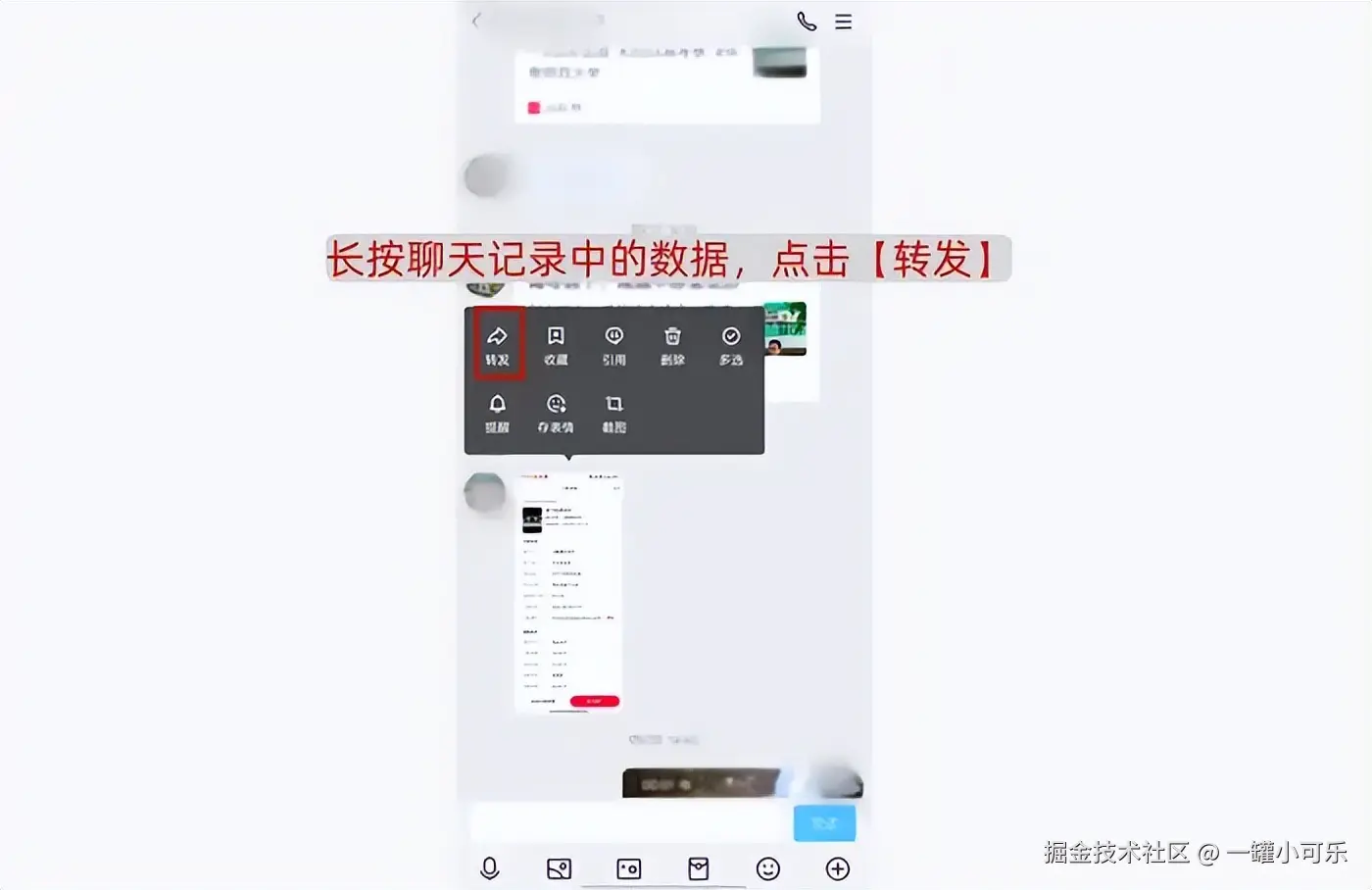 步骤2:长按你希望恢复的聊天内容,在弹出的选项中,选择 【转发】 功能。